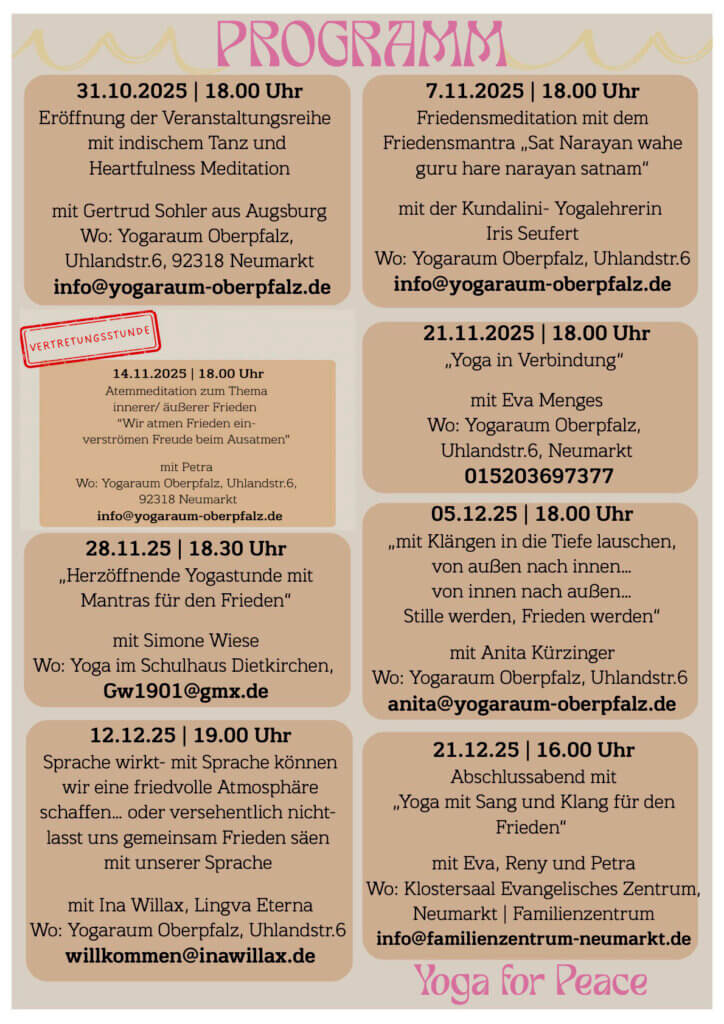 Anmeldungen bitte meldet euch bei der jeweiligen Kursleiterin der Yoga-for-Peace-Veranstaltung an, siehe Bild.